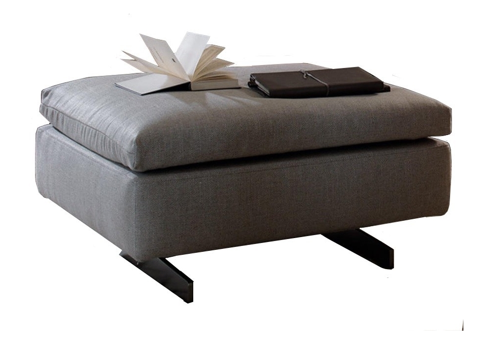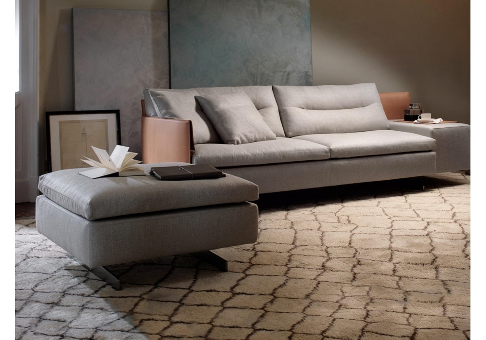 GranTorino is a pouf for Poltrona Frau designed by Jean-Marie Massaud who takes inspiration from the world of saddlery and design GranTorino. A huge amount of freedom in how you put it all together. A modular sofa with an exquisite, original version that combines Saddle Extra Leather with Pelle Frau® leather . Hand-cut, hand-shaped leather closely moulds the lines and structure of the seat. The high and slim armrest also presents intricate, careful workmanship. The small but spacious trunk-container also acts as an armrest and it’s out fitted with an elegant, natural oak tray. The cushions have beautiful horizontal stitching in the centre, which gives the sofa a sense of visual lightness. Comfortable seats, compact, well-cut shapes that reduce the overall dimensions to a minimum, and subtle T-shaped feet that are hidden from view and raise the frame off the ground. The GranTorino frame is in tubular metal with interwoven elastic straps. The backrests and armrests are made of birch and poplar plywood. The padding is made of pressed felt and polyurethane foam in varied densities. The backrest cushions are padded with goose down and have separate horizontal chambers for varied, ergonomic comfort. The feet are aluminium with titanium-coloured varnish.