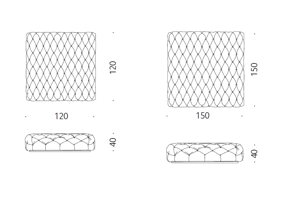 | Dimensions | - 120 x 120 x H 40 cm; - 150 x 150 x H 40 cm; - Ø 120 x H 40 cm. |