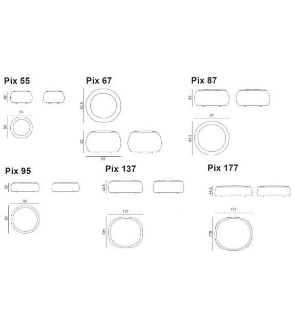 Pix is a poufs collection designed by Ichiro Iwasaki for Arper. Graphic silhouette and color define the soft, generous volumes of Pix. A family of ottomans, at once inviting and iconic, Pix provides a casual touch of comfort in both contract and residential environments, inside or outside. Small one-seat and large one-, three- and five-seat sizes are available in a range of fabrics and colors. In this world where more and more happens between the “main event,” this simple versatility can transform any space into an impromptu, effective surface for working, meeting, reading, a quick coffee break or even complement and extend a flexible office landscape.