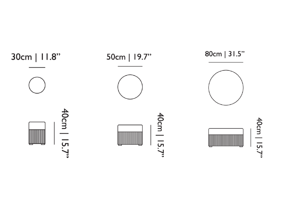 | Dimensions | Small: Ø 30 x H 40 cm Medium: Ø 50 x H 40 cm Large: Ø 80 x H 40 cm |