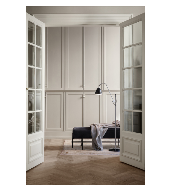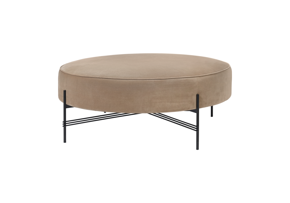 TS designed by GamFratesi for Gubi is a pouf with black legs and upholstery available in different types of leather and fabric. Available in three dimensions. Piping in black leather, brandy leather or matching fabric.
