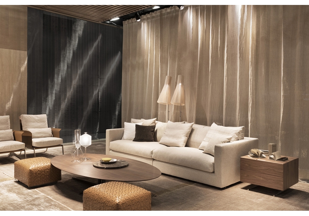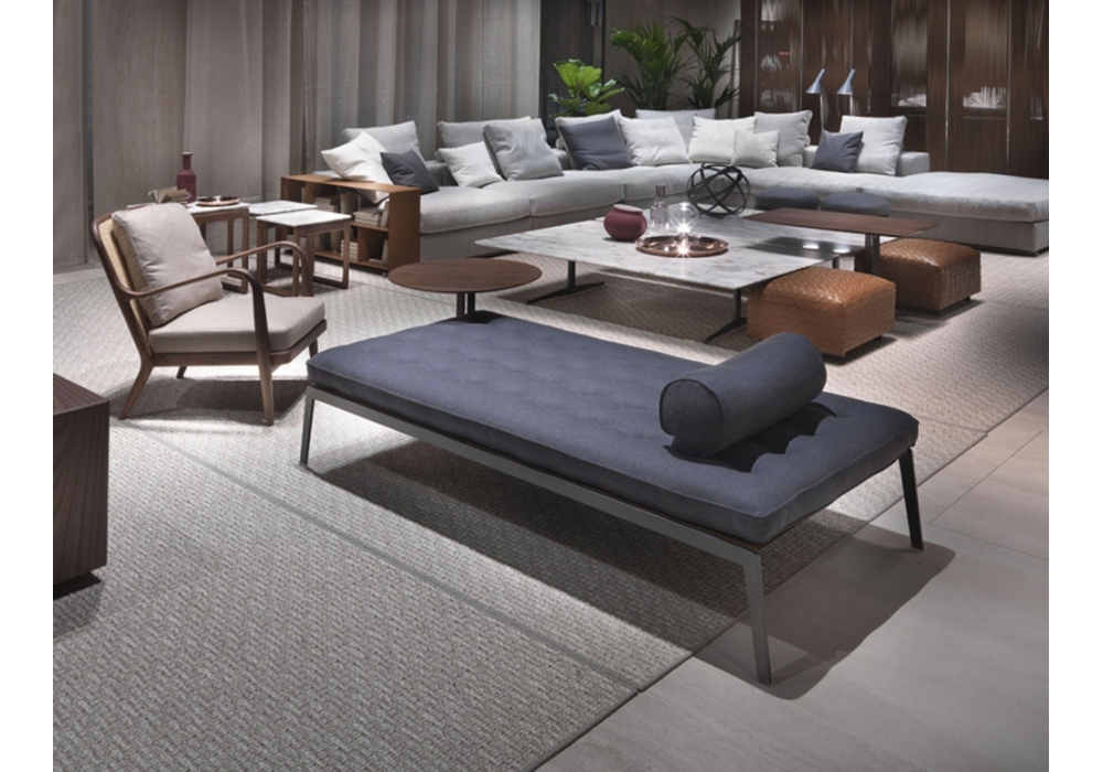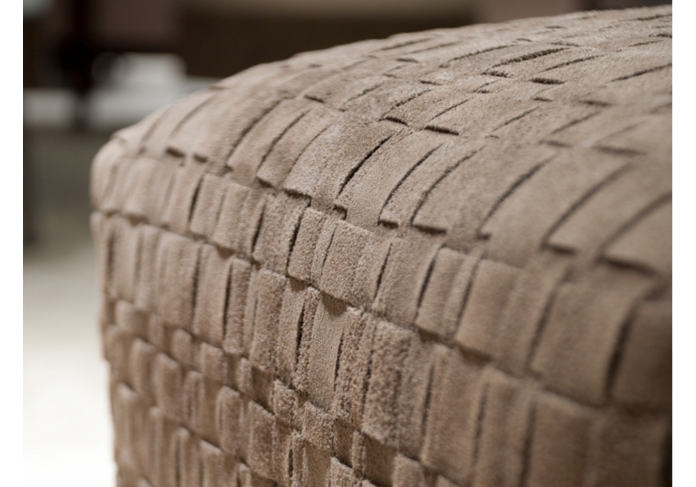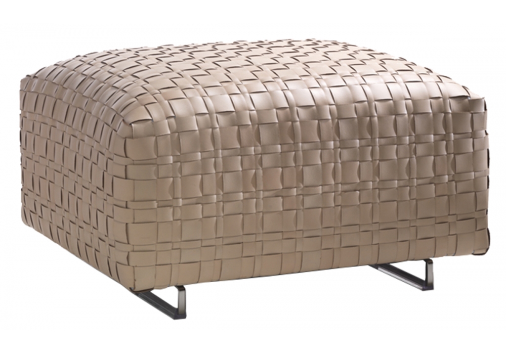 Bangkok designed for Flexform is a pouf with structure in wood and metal with polyurethane padding. Feet in metal available in different finishes. Upholstery in fabric, removable leather or non-removable braided leather. Available in two dimensions.