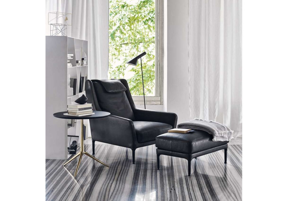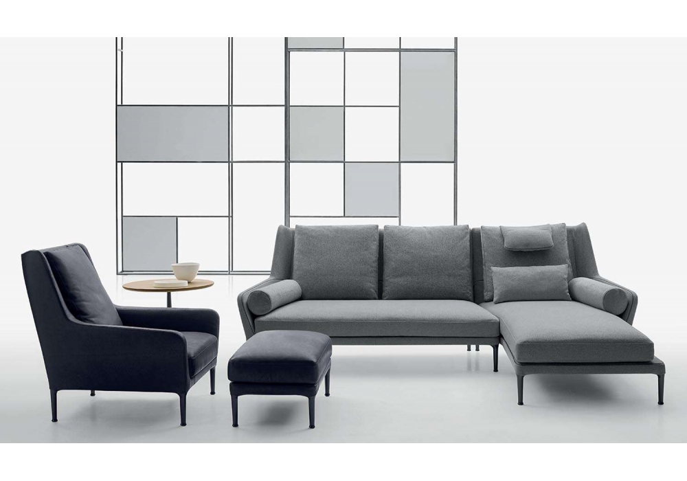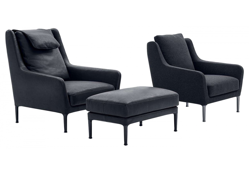 Édouard designed by Antonio Citterio for B&B Italia is a pouf with aluminum feet and fabric or leather upholstery.