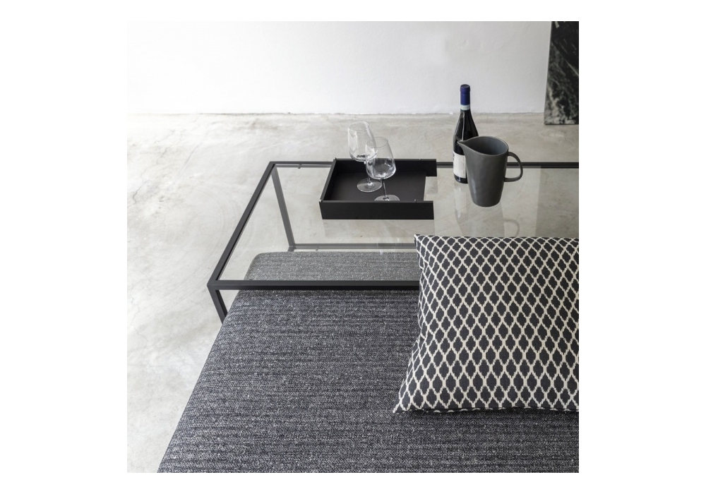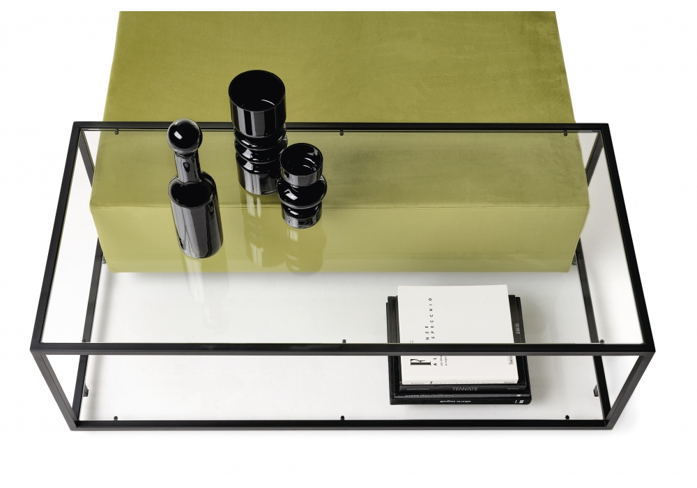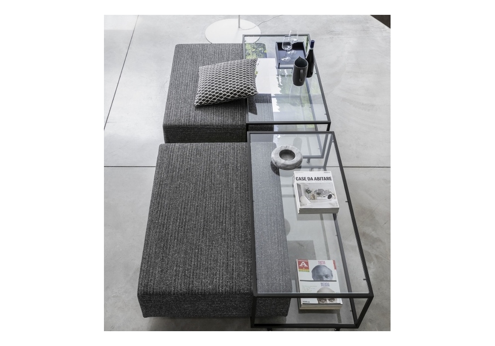 Zoom designed by Uto Balmoral for Mogg is a padded pouf with removable upholstery complete with coffee table with metal structure and transparent glass top. It is possible to fix the coffee table with metal structure in 3 positions. Available in different finishes and dimensions.