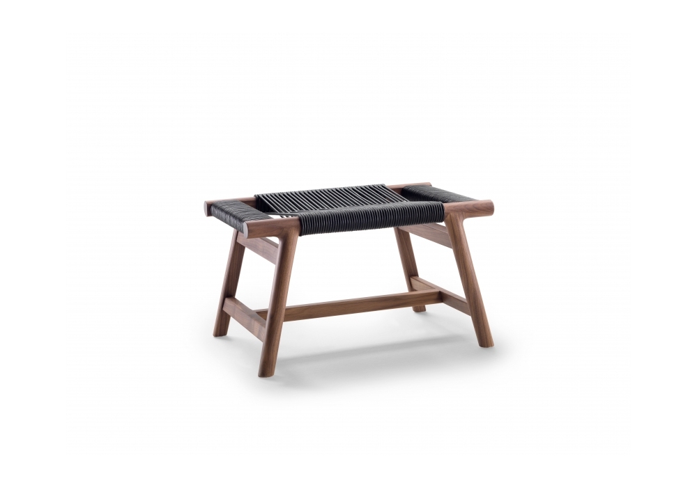 Giano designed by Antonio Citterio for Flexform is a pouf with structure in solid Canaletto walnut or ash and top made from hand-woven hide leather cord.