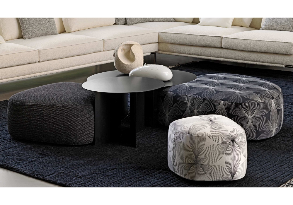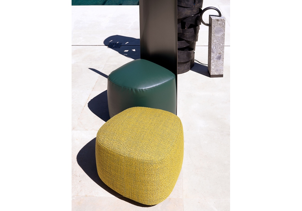 Pierre designed by Studio Contromano for Flou is a collections of upholstered poufs with irregular shapes. Removable covering in fabric or leather with visible topstiches.