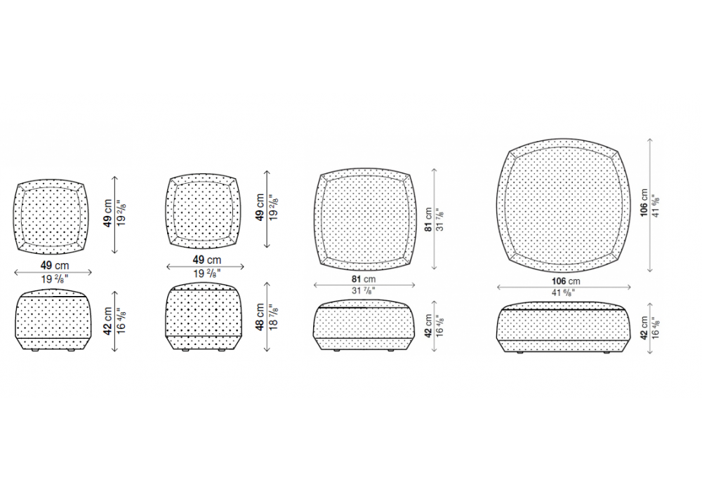| Dimensions | 49 x 49 x H 42 cm; 49 x 49 x H 48 cm; 81 x 81 x H 42 cm; 106 x 106 x H 42 cm. |