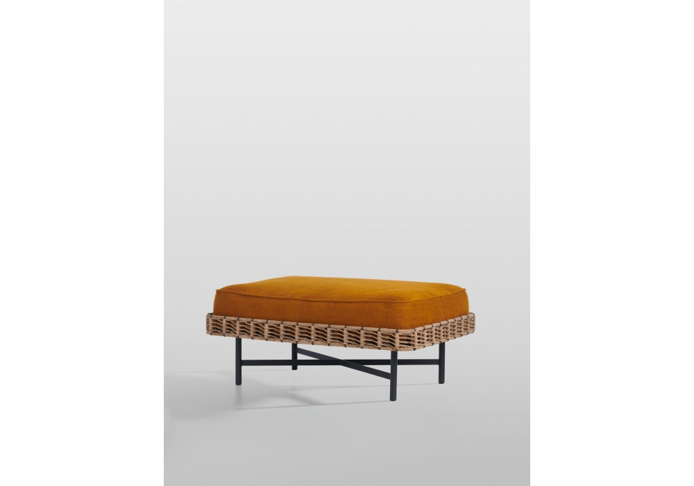 Ropu designed by Chiara Andreatti for Potocco is a rectangular pouf with structure in embossed anthracite painted metal and frame with woven leather cord or dark brown "Gassa" cord. Removable cushion upholstered in fire retardant polyurethane foam with cover in leather, eco-leather or fabric.