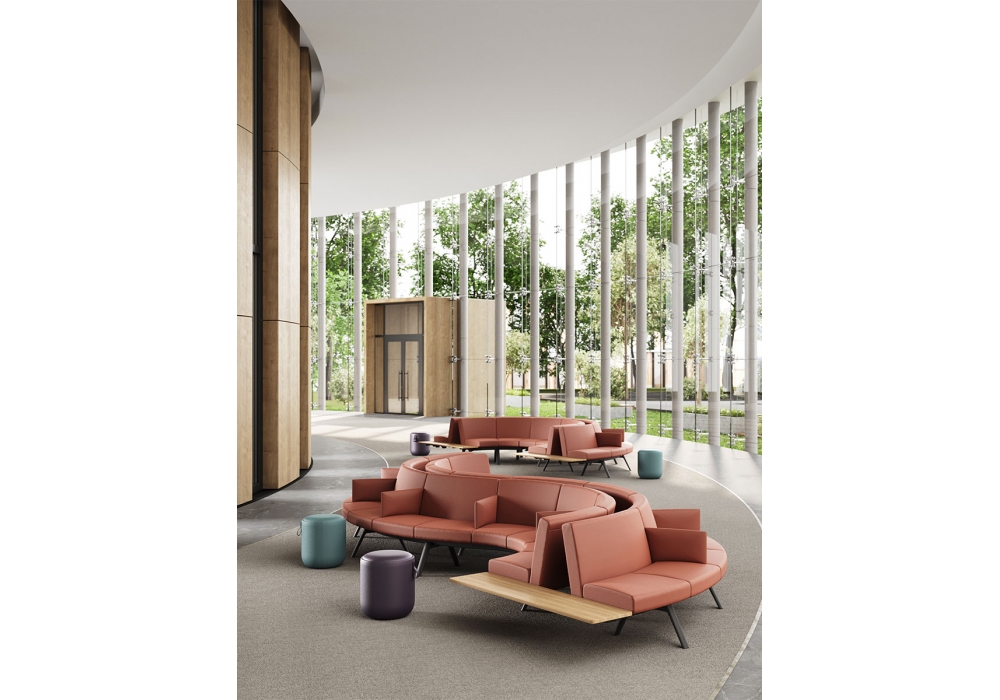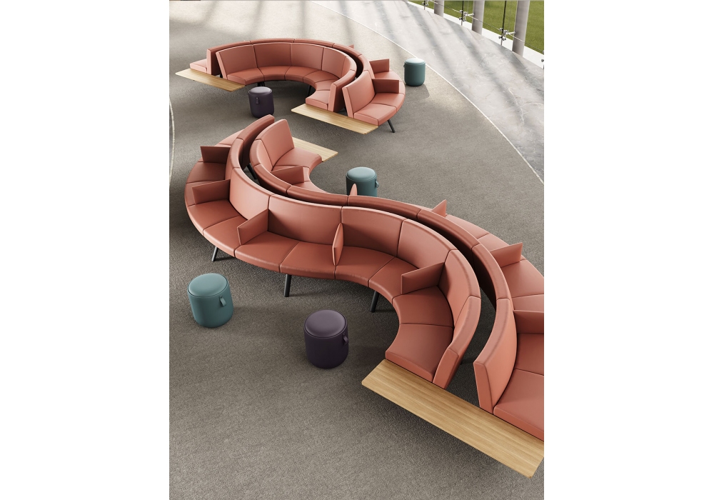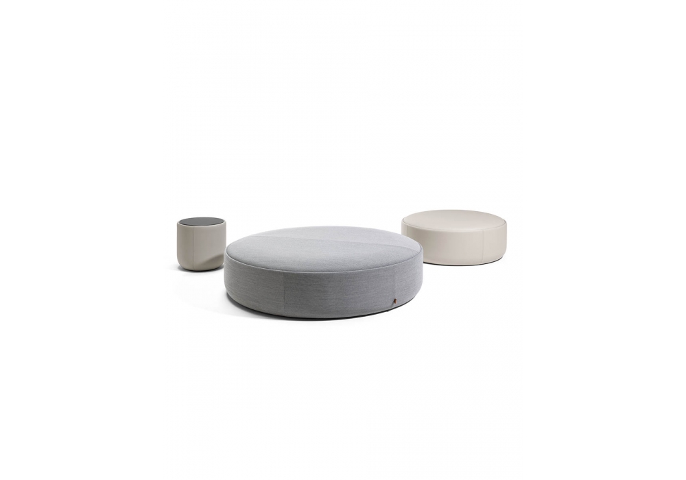 Bay System designed by Foster + Partners for Poltrona Frau is a cylindrical pouf made of medium density wood fibre, solid beech and birch plywood. The padding is in polyurethane foam covered in Pelle Frau® or fabric. The plinth is made up of a black painted metal plate with shaped felt to protect the floor. Bay is available in different finishes.