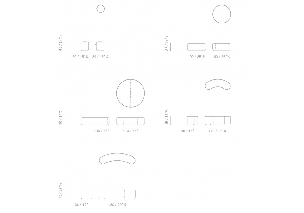 | Dimensions | Ø 39 x H 45 cm; Ø 90 x H 36 cm; Ø 140 x H 36 cm; 120 x 38 x H 45 cm; 180 x 38 x H 45 cm. |