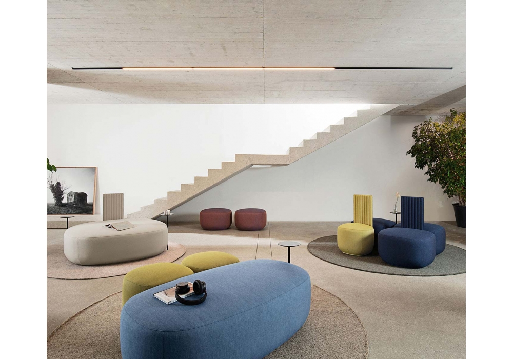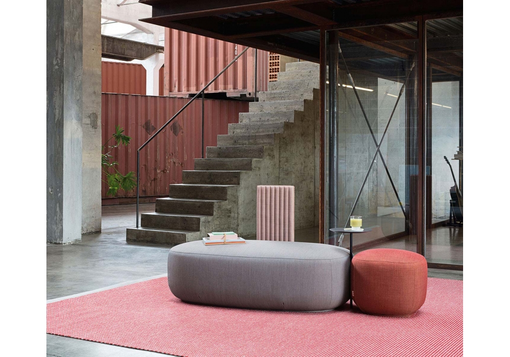 Bakku designed by Margherita Rui for Milani is a pouf made with fireproof expanded resin padding, internal structure in plywood with elastic straps. Fabric or leather covering. Available in different dimensions.