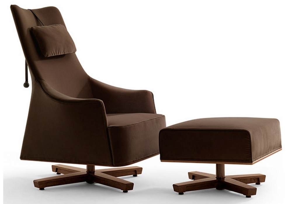 Mobius is a swivel stool designed by Umberto Asnago for Giorgetti. Stool with the swivel base in metal painted in a bronze colour covered with walnut canaletto wood. The padding is in flexible multi-density polyurethane and is covered with removable fabric or leather, with a leather piping available in various colour shades.