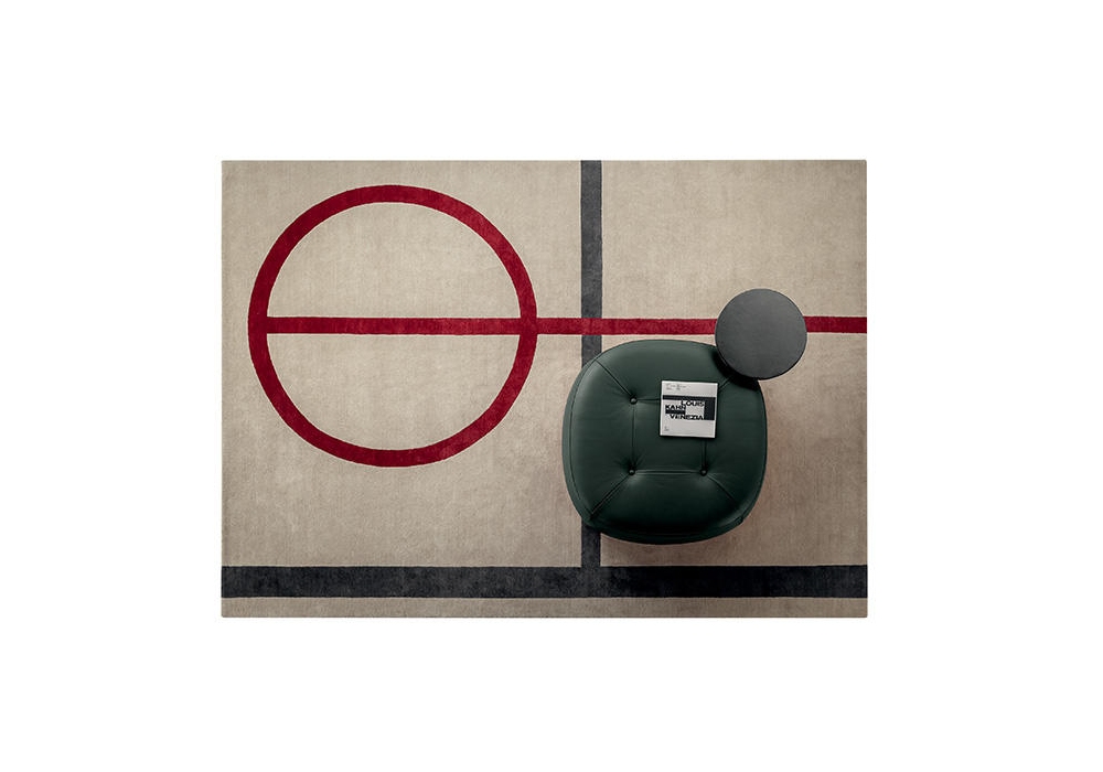 Billie designed by Max Huber for Poltrona Frau is a rug entirely hand-knotted on wooden looms. The geometrical pattern consists of a circle and a vertical line in an intense red shade and two perpendicular lines in anthracite coal grey. Composition: 50% natural wool and 50% natural linen.