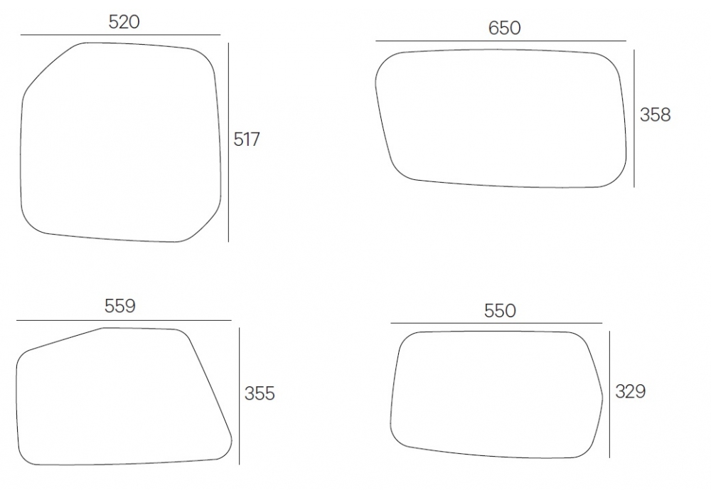 | Dimensions | 520 x 517 x H 1 cm; 558 x 355 x H 1 cm; 550 x 329 x H 1 cm; 650 x 358 x H 1 cm. |