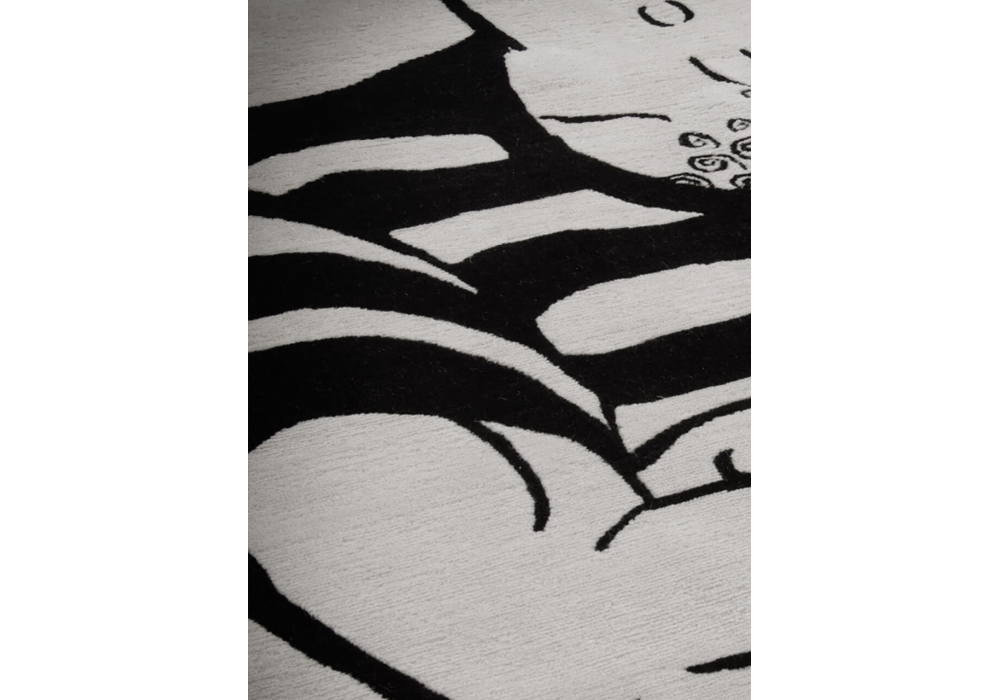Man designed by René Gruau for Amini is a hand-knotted rug 100% New Zealand wool with fringes turned on the back and covered with fabric.