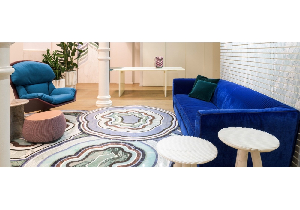 Agata designed by Patricia Urquiola for Budri is a rug made of precious marble and onyx, in marine shades of blue and green.
