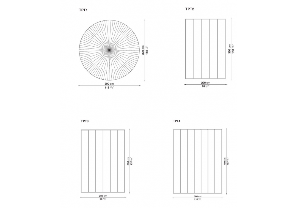 | Dimensions | Ø 300 cm; 200 x 300 cm; 250 x 350 cm; 300 x 400 cm. |