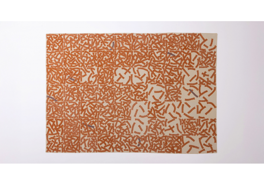 Dedalo designed by CRS for Paola Lenti is a modular rug made by sewing together 30 x 30 cm wool felt elements using Zigzag stitch. Each element is first decorated with a variable number of wool cords and then machine embroidered with a single-colored thread, forming a dense weave. Perimeter stitching using Pettine stitch.