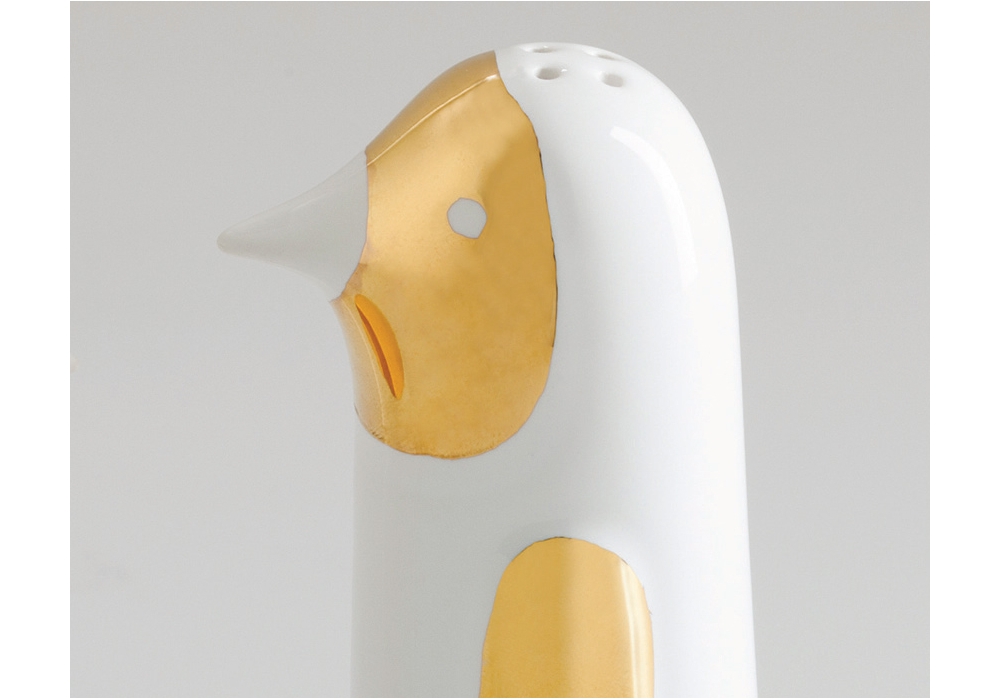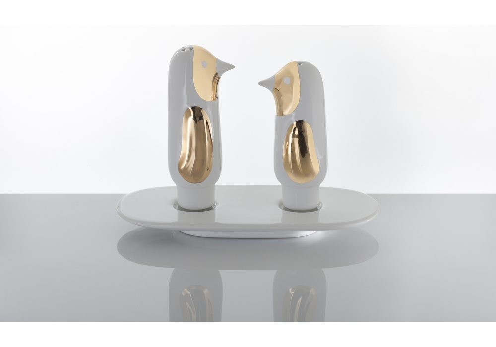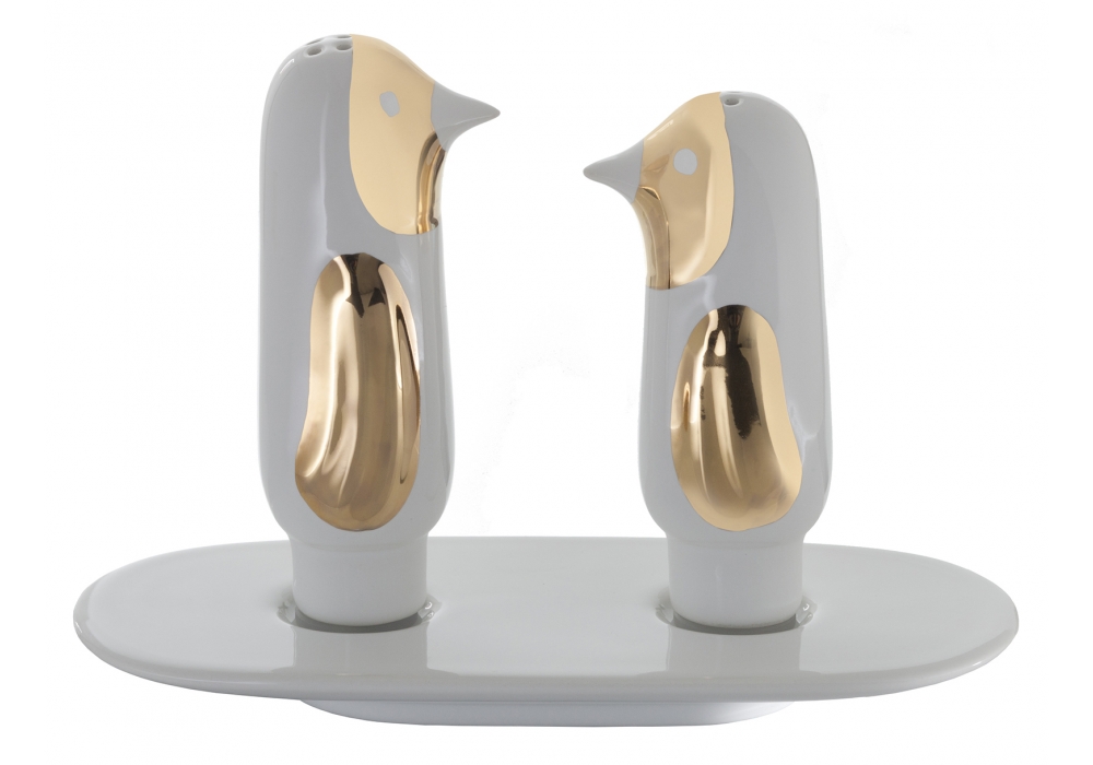 Salt and Pepper designed by Jaime Hayon for Bosa is a set sale e pepper made of white ceramic with gold details. Table collection includes also plates, cups, bowls, and decanter.