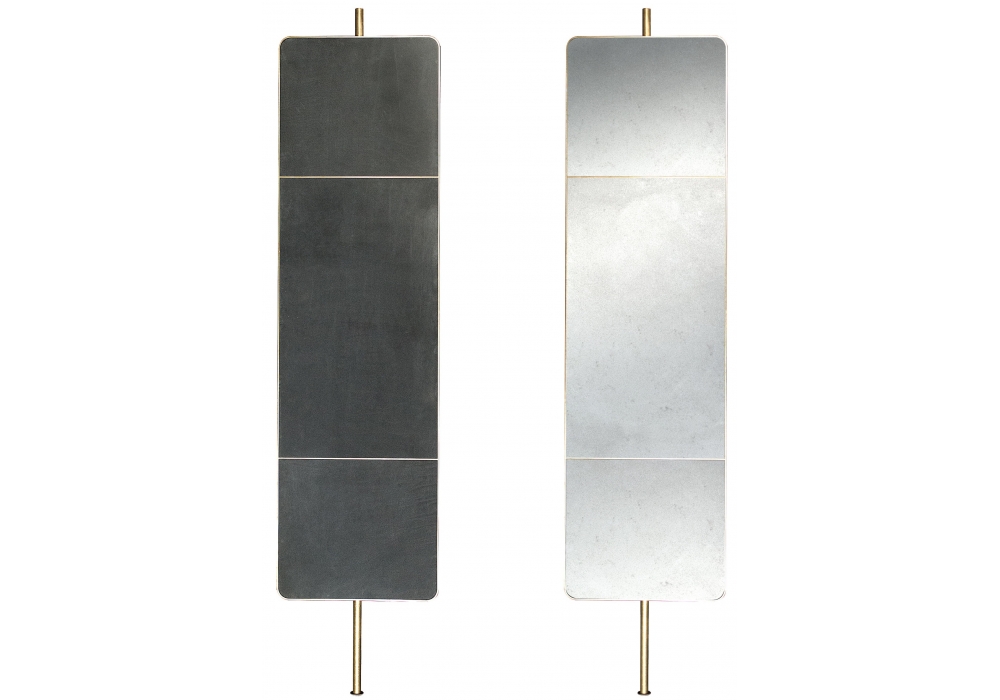 Oddo designed by Baxter P. is a two-faced screen with revolving structure in antiqued brass, consisting of one side in antiqued mirror and one with leather covering. Available in two ranges of height.