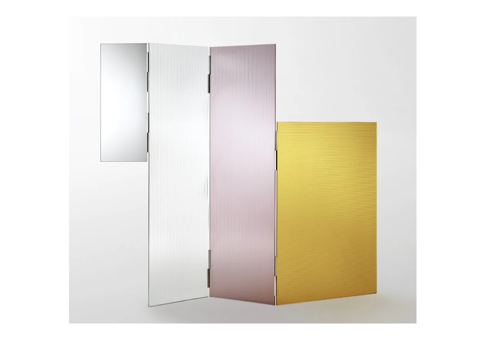 Rayures designed by Ronan & Erwan Bouroullec for Glas Italia is a modular screen with hinged panels in laminated and tempered Flutes glass. A mirror is also available that can be positioned at one end of the composition. The grain of the crystal is horizontal or vertical, depending on the format of the panel, the hinges are in anthracite chromed brass.