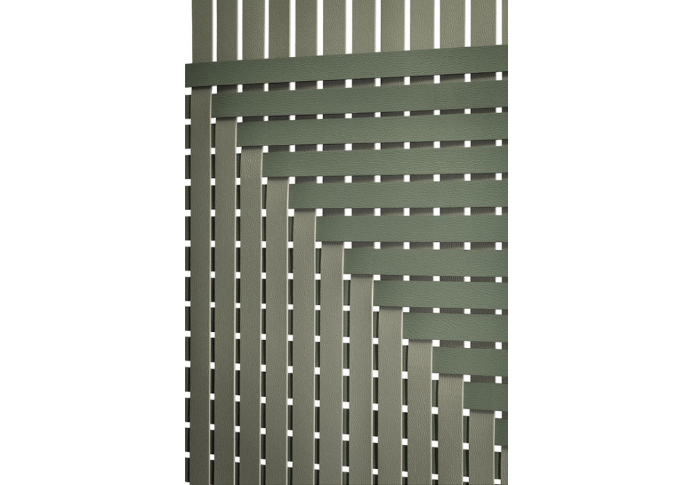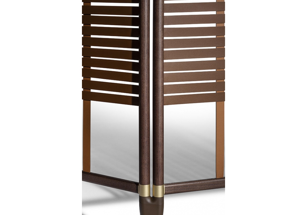 Plot designed by GamFratesi for Poltrona Frau is a room dividers with aluminium tubing veneered with a moka finish connected with metal joints with a matt brass finish. At the bottom the structure is supported by metal feet with matt brass finish hooked to metal conical caps painted brown. The leather bandsare hooked to th metals tubes and are woven to create a circular or square design.