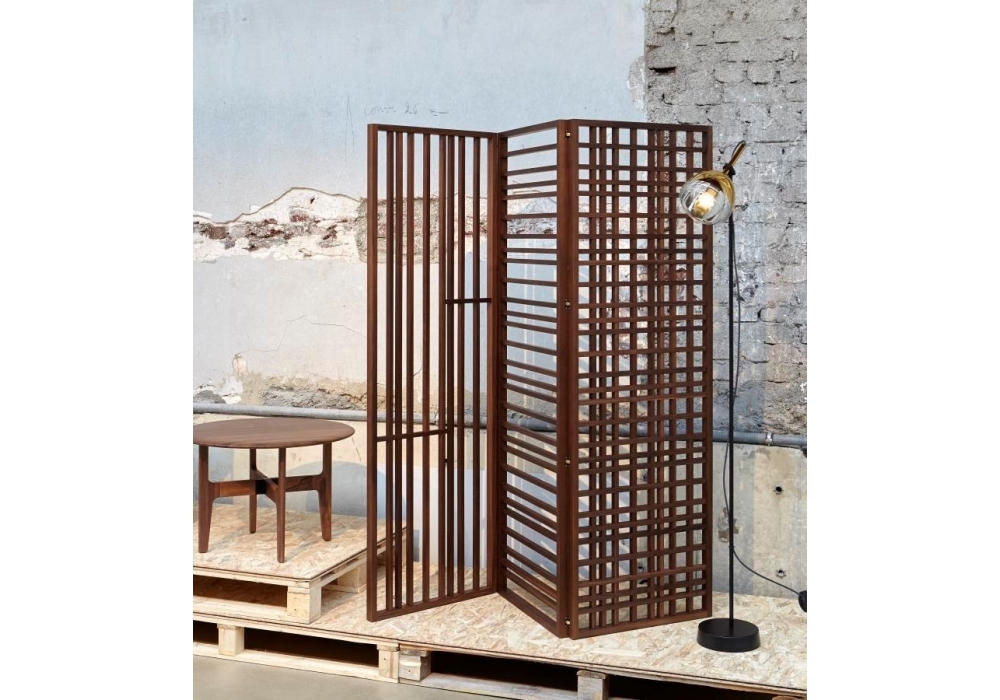 Paravent designed by Marie Christine Domer for Ligne Roset is a screen in solid American walnut, oiled, made up of 3 panels of 51 cm connected by 4 hinges. Supplied with felt pads.