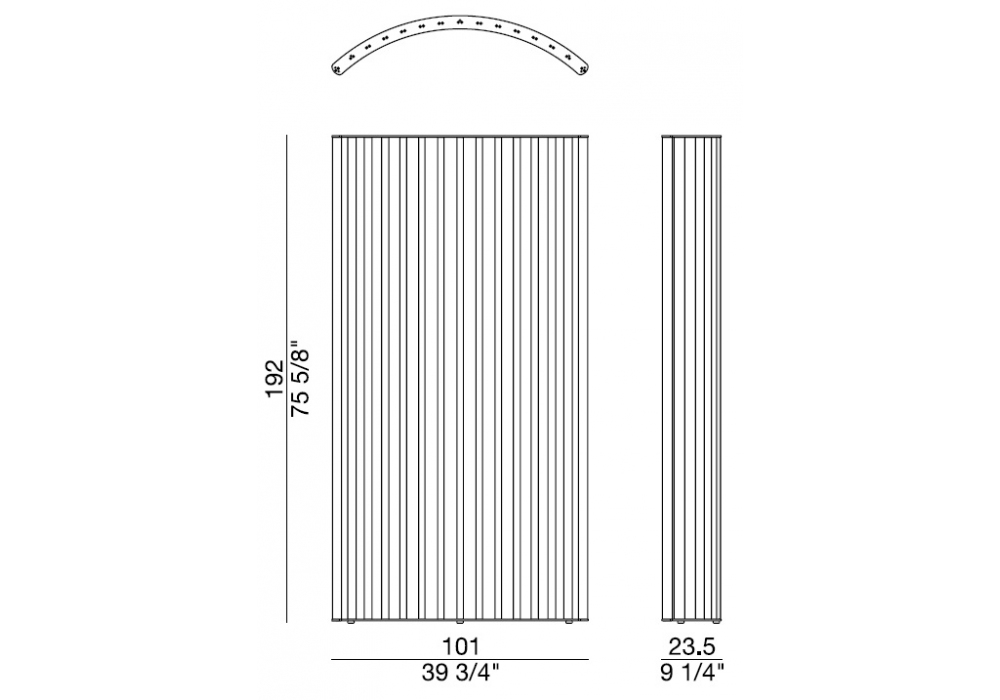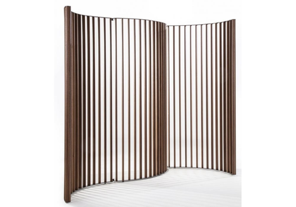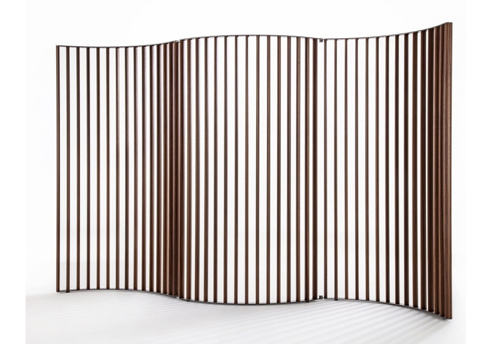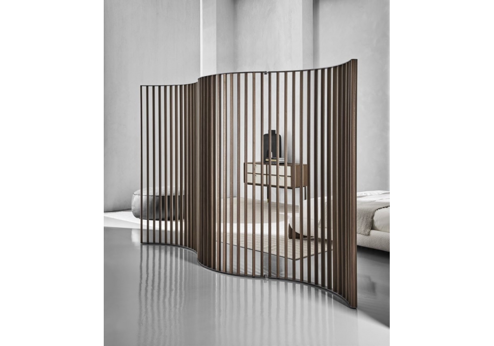 Gamen designed by T. Colzani for Porada is a modular screen made up of two or more curved modules with aluminum profiles covered in Canaletta walnut. Pewter finish metal structure and adjustable feet. The modules are hinged together allowing free configurations.