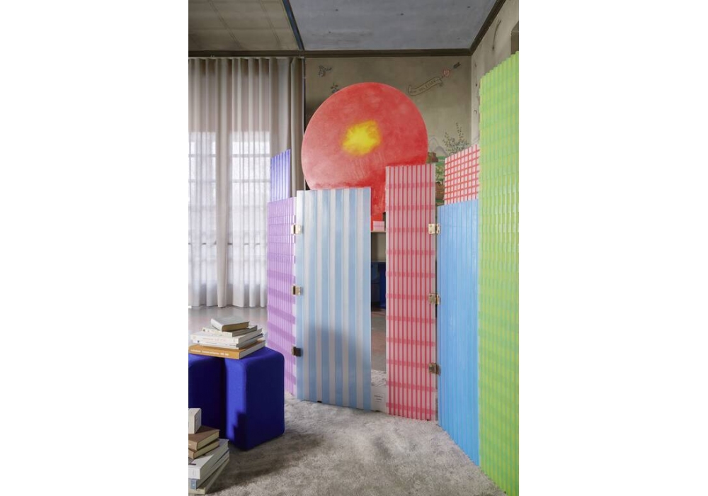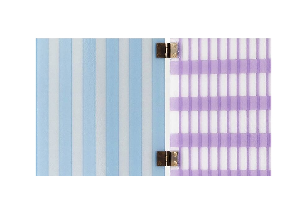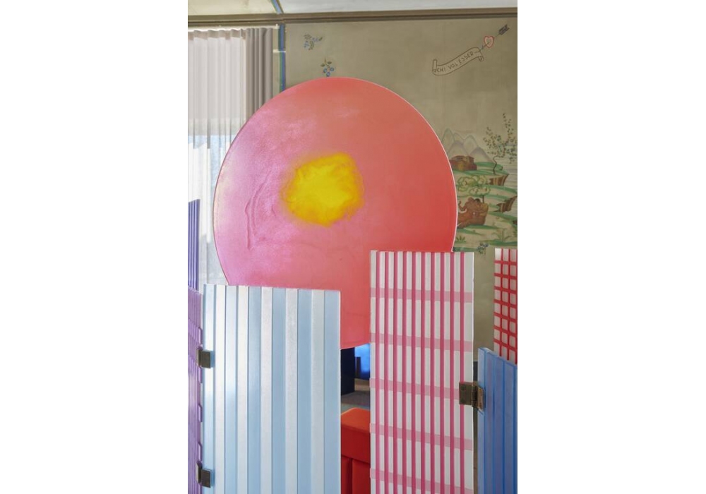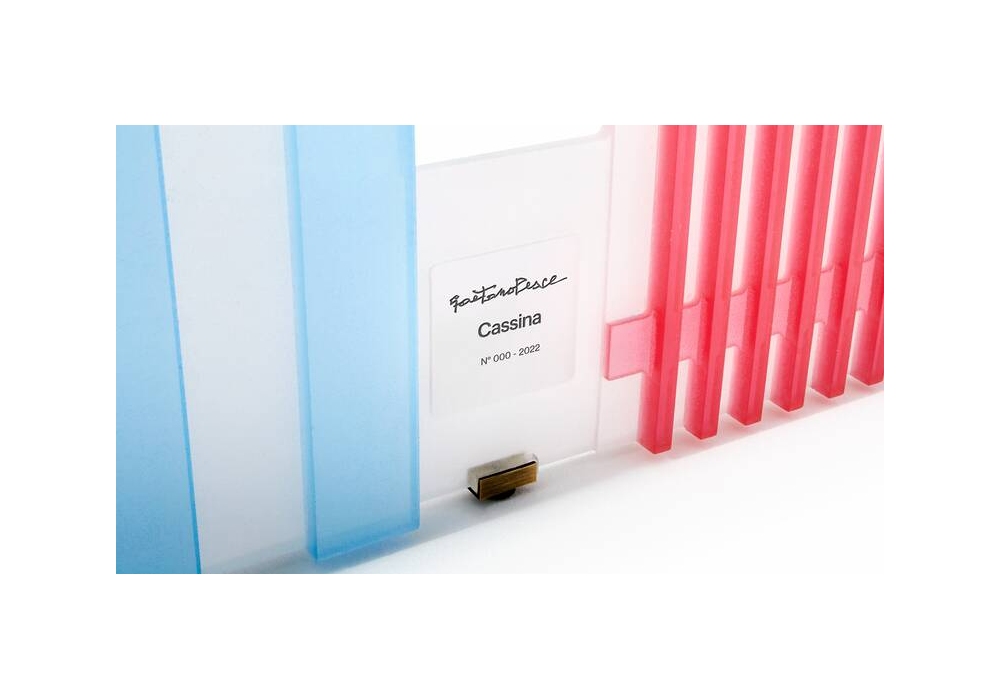 Tramonto a New York designed by Gaetano Pesce for Cassina is a three-door screen in colored resin, with burnished brass hinges and feet. Numbered edition.
