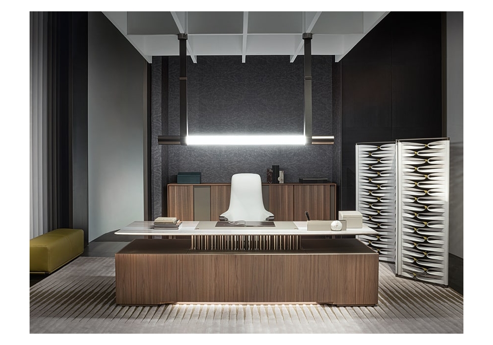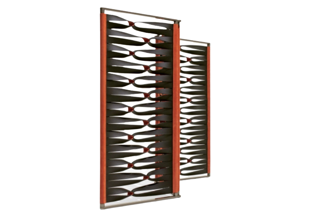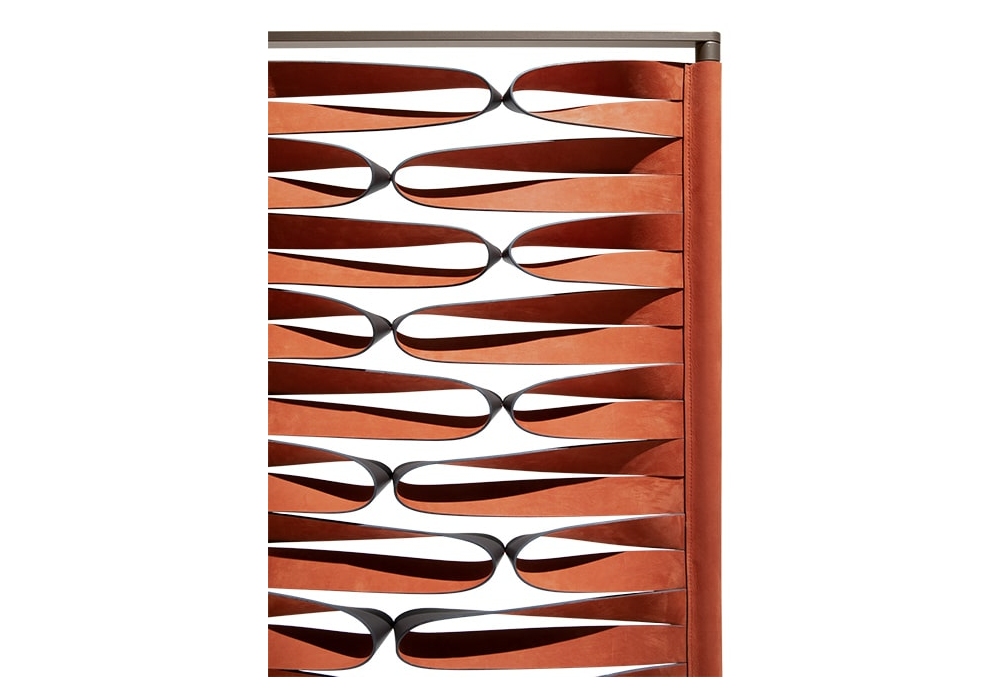Borealis designed by Roberto Lazzeroni for Giorgetti is a screen with aluminum structure painted in pewter finish, composed of two-tone leather bands folded into a buttonhole and sewn together by hand. The compositions are available in two heights. The screen consists of three rotating doors equipped with locking mechanisms that prevent both total closure and total opening to maintain stability.