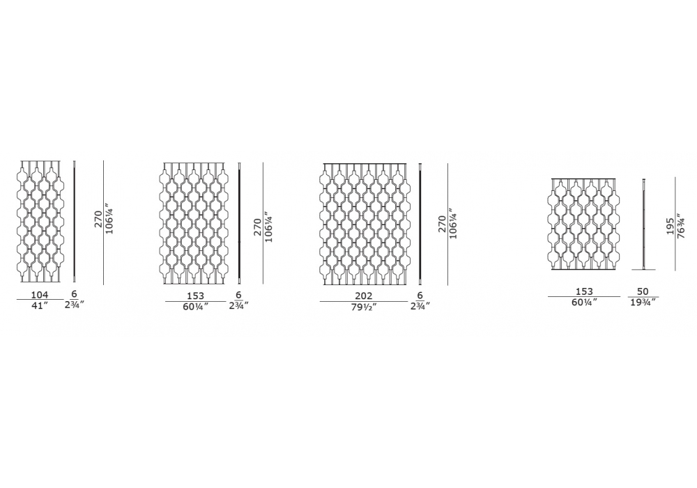 | Dimensions | • 104 x 6 x H 270 cm; • 153 x 6 x H 270 cm; • 202 x 6 x H 270 cm; • 153 x 50 x H 195 cm |