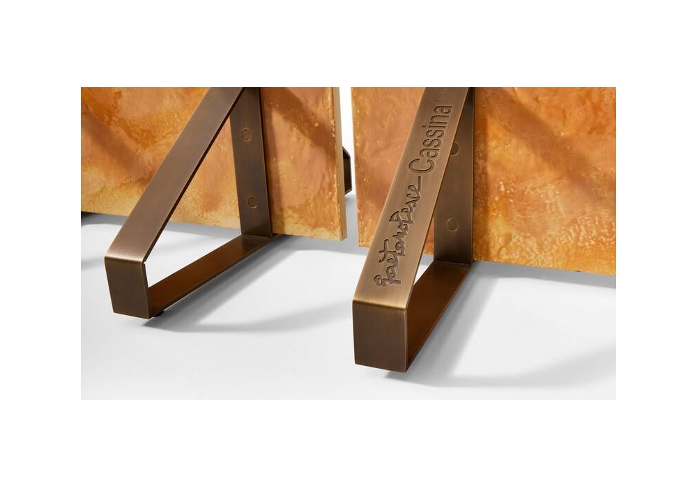 Paravento Risacca designed by Gaetano Pesce for Cassina is a screen composed of three panels fixed on six brass bases, they are made by casting a transparent resin in a wooden mold similar in effect to oil paint, capable of returning , imprinted on the material, every gesture made by the artist, giving the work that three-dimensionality that makes it unique. A bluetooth speaker is inserted in the foot of the central panel.