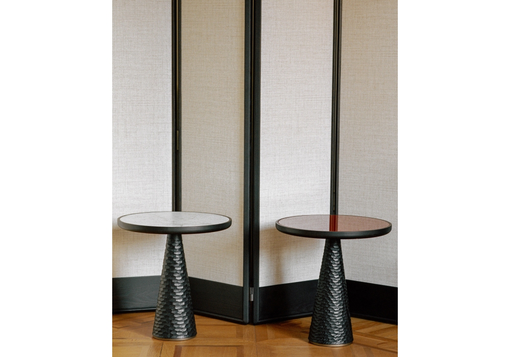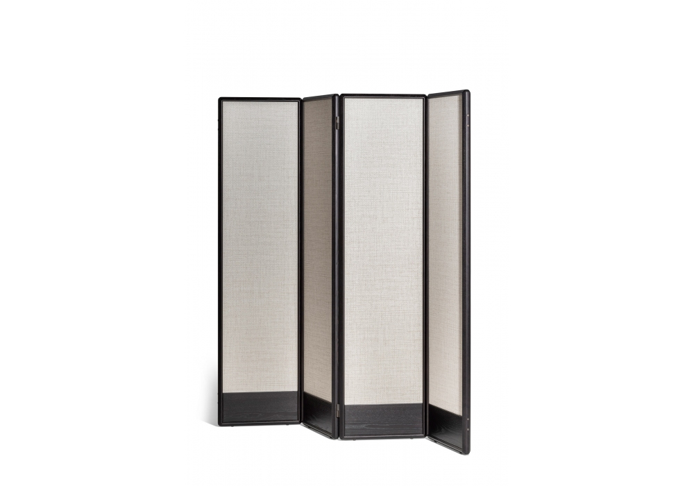 Duo Screen designed by Roberto Lazzeroni for Poltrona Frau & Ceccotti Collezioni is composed of solid ash frame and hollow panels witk wallpaper covering. The front and rear of the panels can be covered with different finishes.