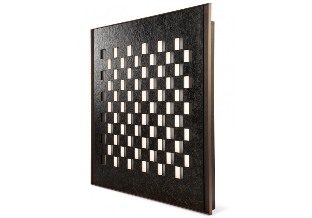 The Cabinet of Memories designed by Chi Wing Lo for Giorgetti is a sculpture cabinet with 120 compartments in maple wood and carbon. The sliding door, that covers and shows 60 compartments at a time, is in carbon and the frame is in brushed bronze titanium. The cabinet is backlit with LEDs whose light intensity can be regulated.