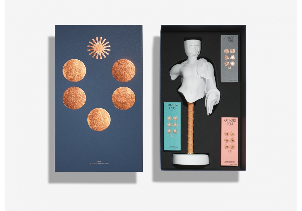 LCDC L'amante Pure White designed by Luca Nichetto for Ginori 1735 is a refillable candle holder statue with 3 sets of six 40g scented candles, one for each fragrance. Hand decorated with precious metals. Materials: Porcelain / Plastic / Wax.