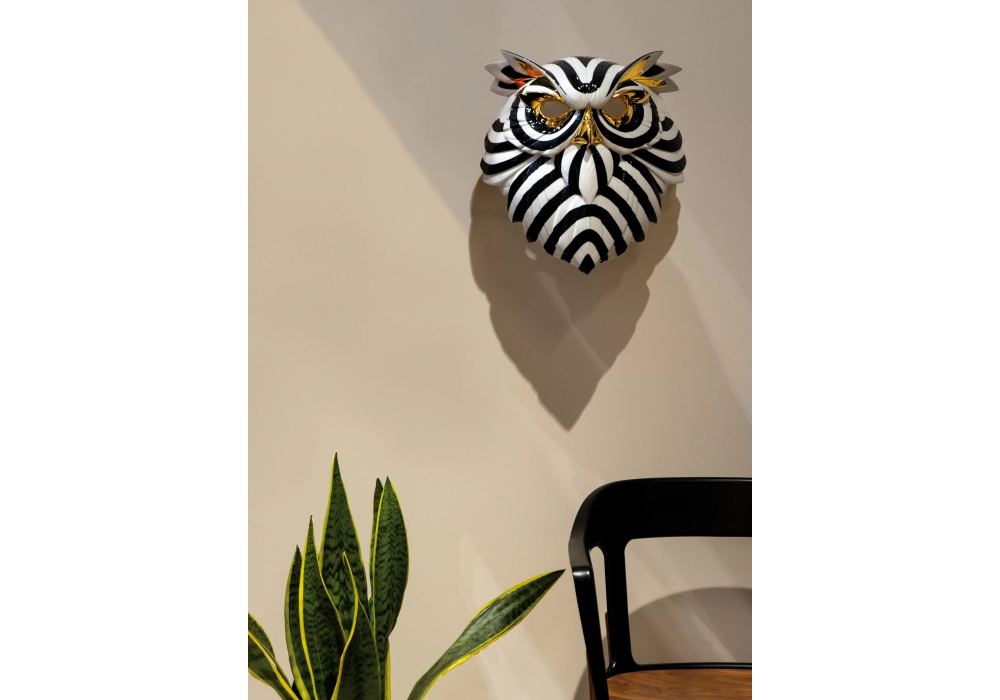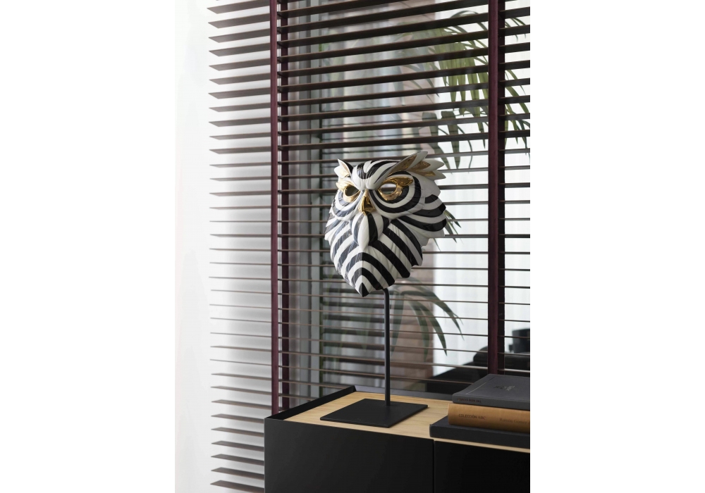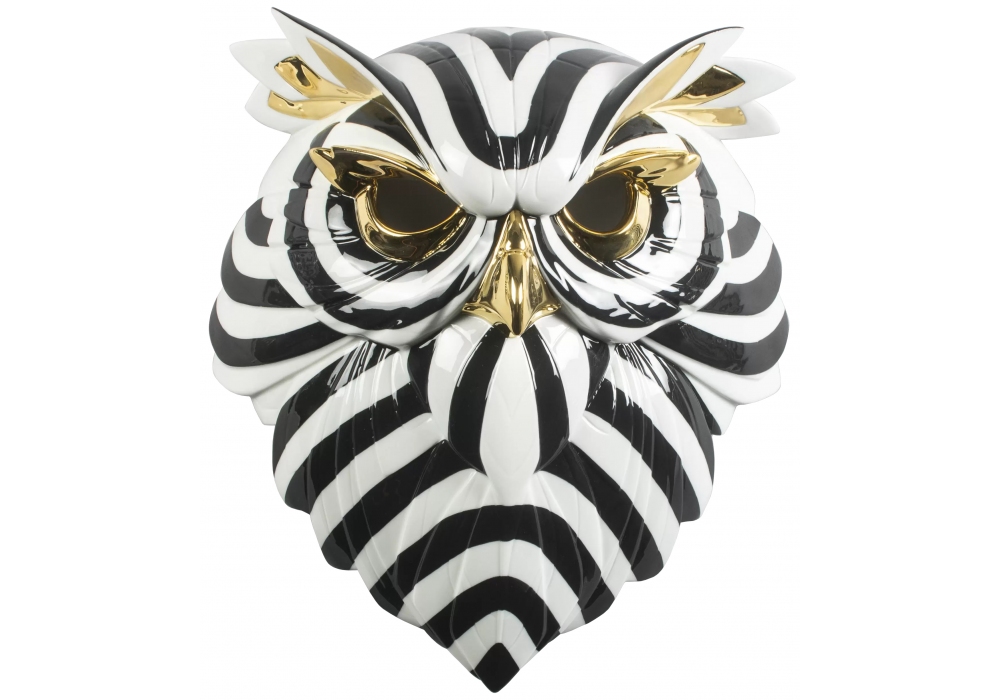 Maschera Gufo sculpted by José Luis Santes for Lladró is a black, white and gold glossy porcelain sculpture, entirely made and hand painted by the Lladró artists.