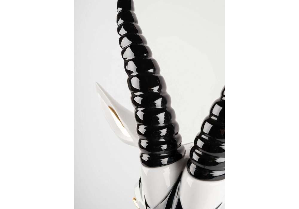 Maschera Antilope sculpted by José Luis Santes for Lladró is a black, white and gold glossy porcelain sculpture, entirely made and hand painted by the Lladró artists.