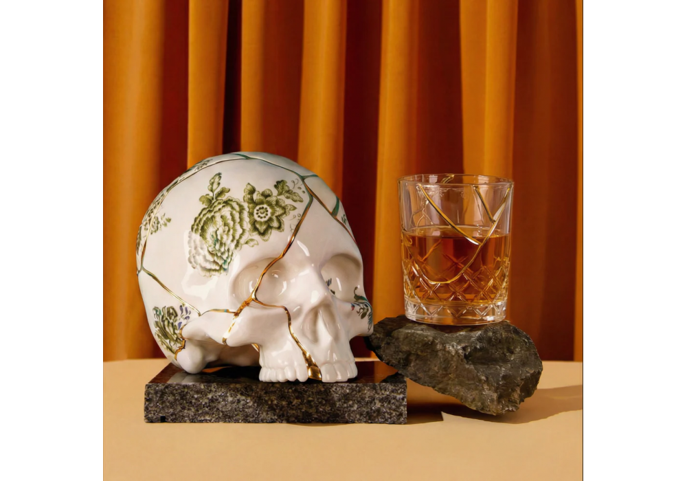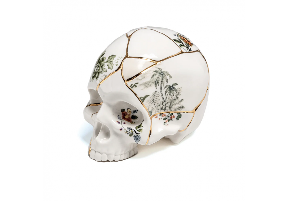 Kintsugi Skull designed by Marcantonio for Seletti is a sculpture that represents the human anatomy of a skull made entirely of white porcelain decorated with various graphics and finishes.