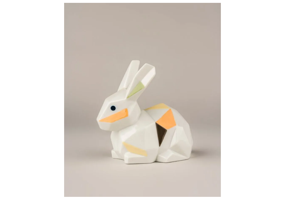 Rabbit designed by Marco Antonio Noguerón for Lladró is a glossy porcelain sculpture decorated with green, yellow, orange and grey details.