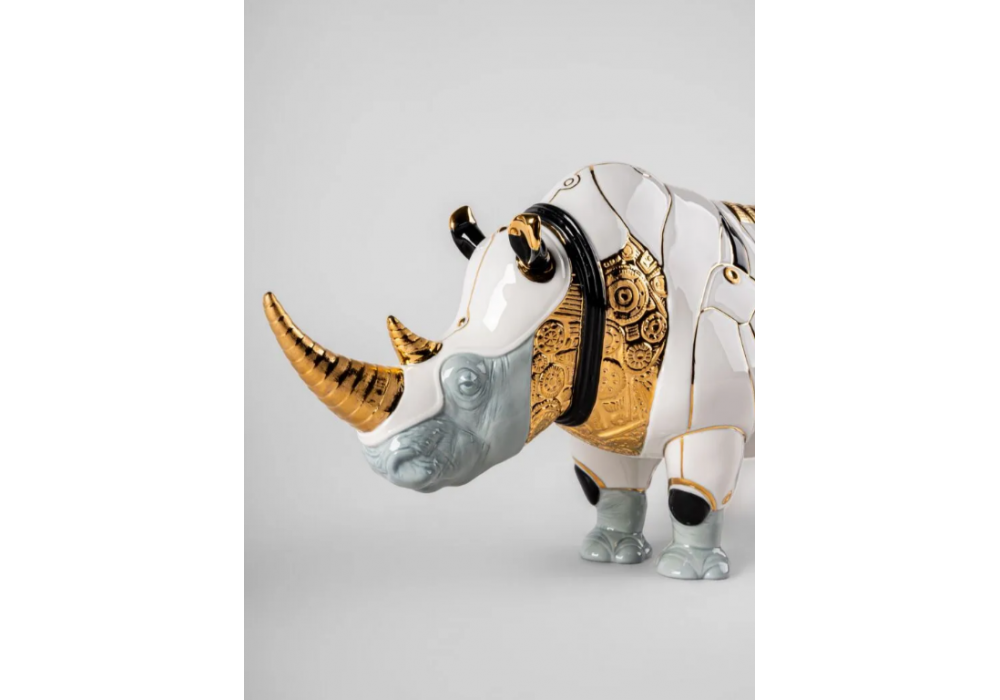 Rhino Cyborg by Ernest Massuet for Lladró is a porcelain sculpture in glossy finish, entirely made and hand painted by the Lladró artists.