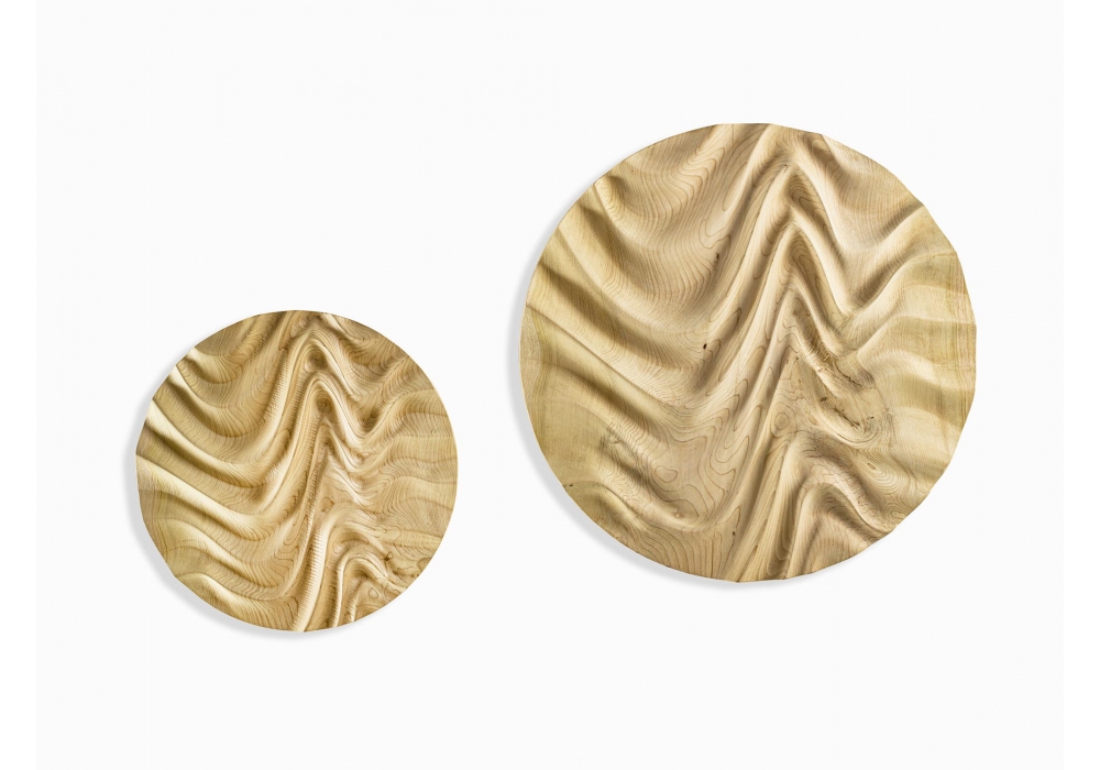 Cedar Art Wave designed by Authentic Design for Riva 1920 is a sculptural decoration in solid cedar wood with glued strips. The Cedro Vulcano finish is available for indoor use only. Available in different finishes.