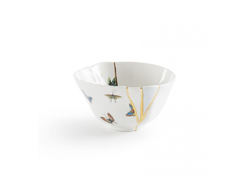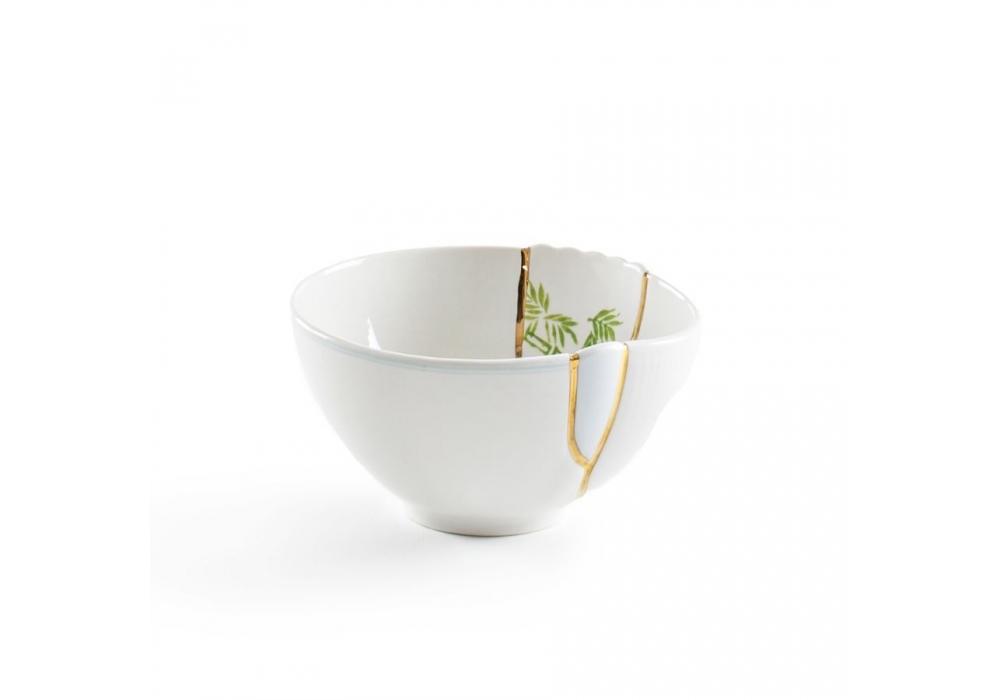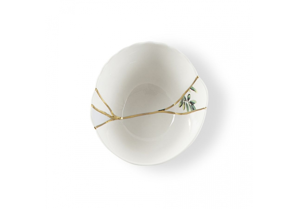 Kintsugi designed by Marcantonio for Seletti is a white and gold porcelain bowl created by combining two opposing shapes. The surface is decorated with various floral figures and pigments.