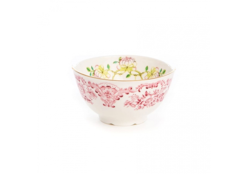 Hybrid Olinda designed by CTRLZAK for Seletti is a white porcelain bowl created by combining two opposing shapes. The surface is decorated with various floral figures and pigments.