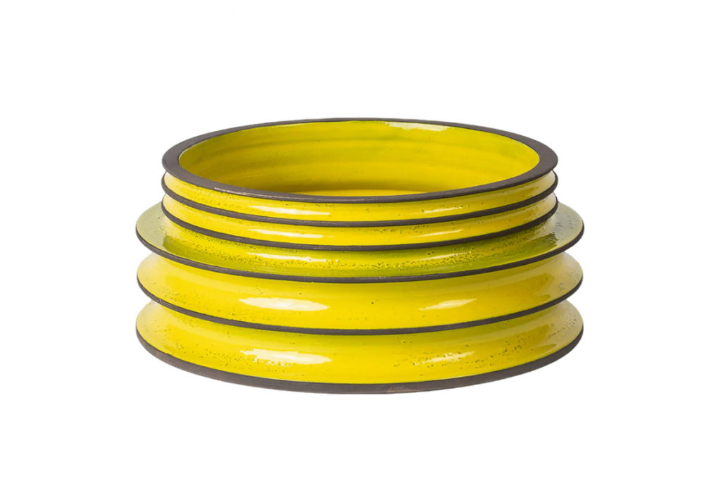 Bolo Revolver designed by Christoph Radl for Bitossi Ceramiche is a white clay casting bowl. Painted in yellow or orange crystalline over brown engobe , a clay-based color that is spread on the still raw ceramic surface. It present a rough surface that is given by the presence of sand grains inside the engobe.
