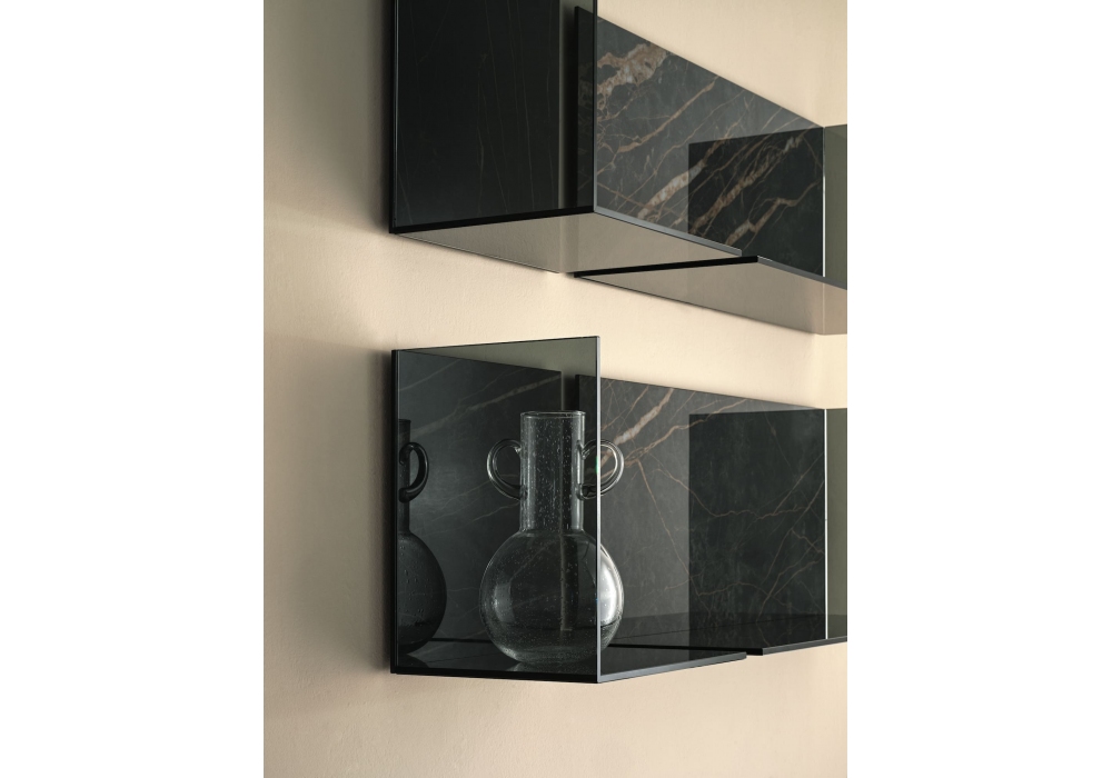 09.52 Zen designed by Bontempi is a composition of shelves composed of crystal top and side, and marble back.