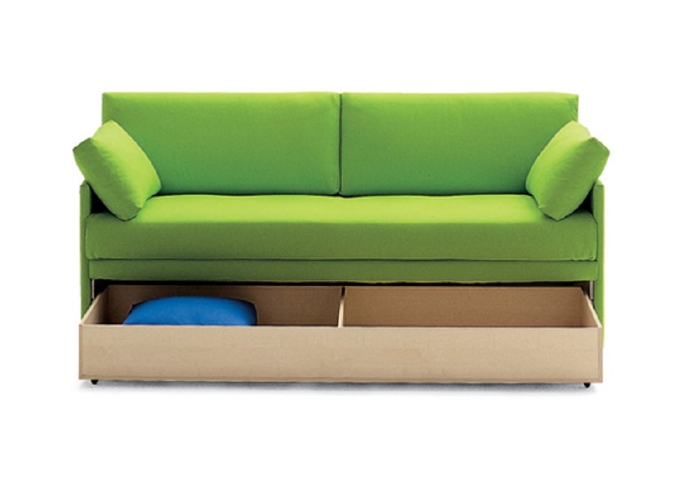 Sky Due designed by Campeggi is a sofa bed with an extra pull out bed or a wood container underneath. Wooden bed slats and polyurethane foam or spring mattress. Removable cover.