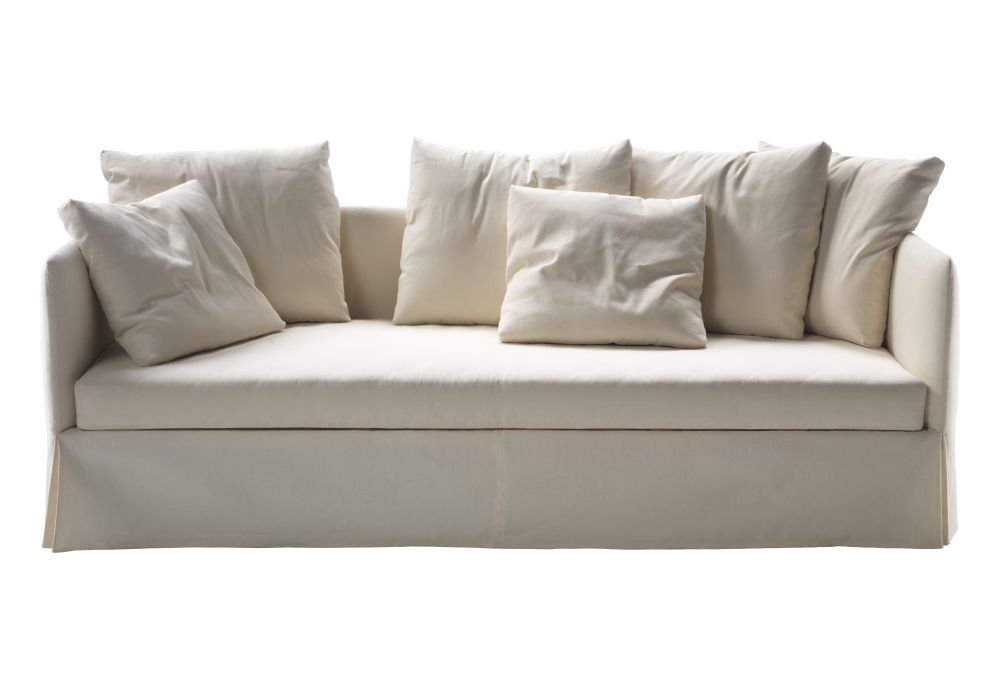 Twins designed by Giulio Manzoni for Flexform is a sofa bed with metal and wood structure, seat composed of polyurethane and dacron mattress, wood and polyurethane backrest and goose down padded back cushions. The second bed is extractable and composed with grey lacquered metal structure and platform with wooden slats.