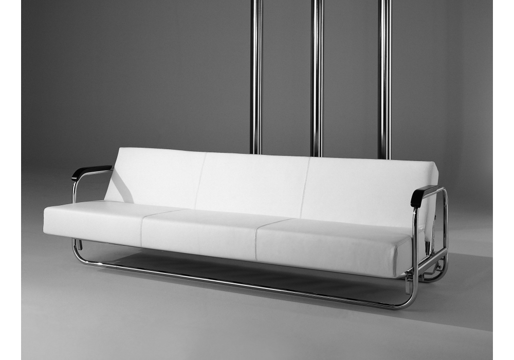 AA1 designed by Alvar Aalto for MisuraEmme is a sofa bed made with chromed tubular structure, armrests in black lacquered solid wood and removable upholstery in fabric or leather. Backrest cushion with adjustable inclination.