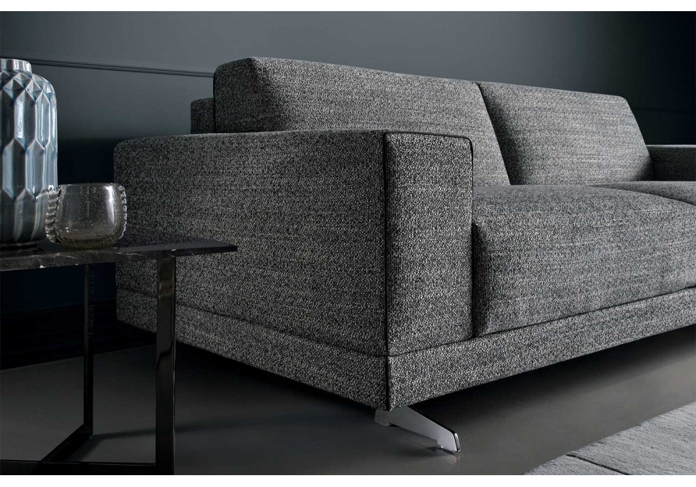 Jimmy designed by Studio Res for Bodema is a sofa that can be transformed into a bed. Wooden frame covered in polyurethane foam. Seat in D35 polyurethane foam. Backrests in D25 polyurethane foam. Slatted base. Backrests with pillow compartment. SIMMONS pocket sprung mattress H 13 cm and 200 cm long. Total size of open sofa bed 218 cm. Metal foot in black nickel finish. Padded armrests available in widths of 12, 17 and 23 cm. Sofa completely disassembled. Removable upholstery in both fabric and leather.