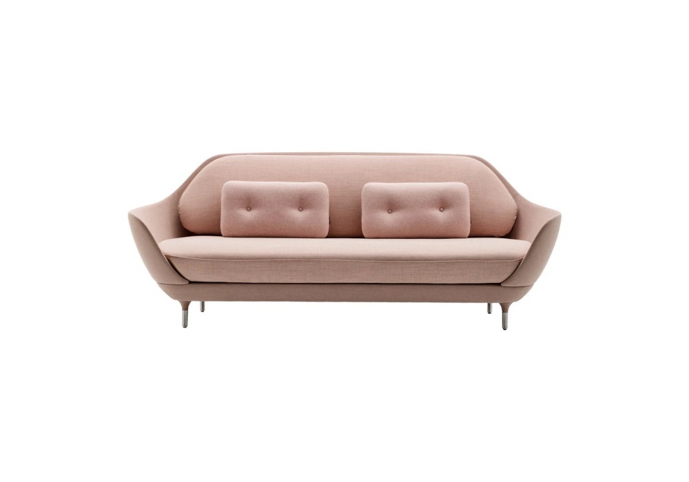 Favn designed by Jaime Hayon for Fritz Hansen is a three-seater sofa made with fabric or leather upholstery and brushed aluminum feet. Includes two decorative cushions in the same finish as the sofa. Available in different finishes.